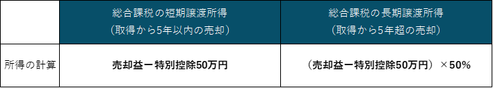 金を①の現物の金地金・金貨、若しくは②の純金積立で購入した場合は総合課税で累進課税が適用されると書きましたが、税率を掛ける所得はいくらになるかというと、金を購入してからどれぐらいの期間保有していたかで所得の金額が変わります。具体的には保有期間が5年以下かどうかで線引きがあります。保有期間が5年以下の場合は金の売却額-金の購入額-特別控除50万円が所得となりますが、保有期間が5年超の場合は(金の売却額-金の購入額-特別控除50万円)×50%が所得となります。保有して4年で売却するのであれば、税務的な観点だともう1年待って5年経ってから売却した方が基本的には税金は安くなります。